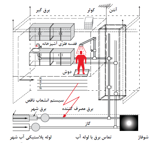 ﻫﻤﺎﻧﻄﻮرﻳﻜﻪ در اﻳﻦ ﺷﻜﻞ ﻧﻤﺎﻳﺎن اﺳﺖ ﭼﻨﺎﻧﭽﻪ ﻳﻜﻲ از ﻓﺎز ﻫﺎي ﺑﺮق ﺷﻬﺮ ﺑﻪ ﻟﻮﻟﻪ ﻛﺸﻲ آب و ﻳﺎ دﻳﮕﺮ ﻓﻠﺰات ﺳﺎﺧﺘﻤﺎن ﺑﺮﺧﻮرد ﺑﻜﻨﺪ ﻛﻠﻴﻪ ﻓﻠﺰات و ﻟﻮﻟﻪ ﻛﺸﻲ ﻫﺎي ﻛﻞ ﺳﺎﺧﺘﻤﺎن داراي وﻟﺘﺎژ ﺧﻄﺮﻧﺎﻛﻲ ﺑﺮاي اﻧﺴﺎن ﻣﻲ ﺷﻮﻧﺪ.