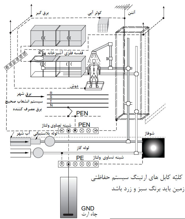 - اﺗﺼﺎل ﻧﻤﻮدن ﻛﻠّﻴﻪ ﻗﻄﻌﺎت ﻓﻠﺰّي ﺳﺎﺧﺘﻤﺎن وﻛﺎرﮔﺎه ﻫﺎ ﺑﻪ زﻣﻴﻦ.