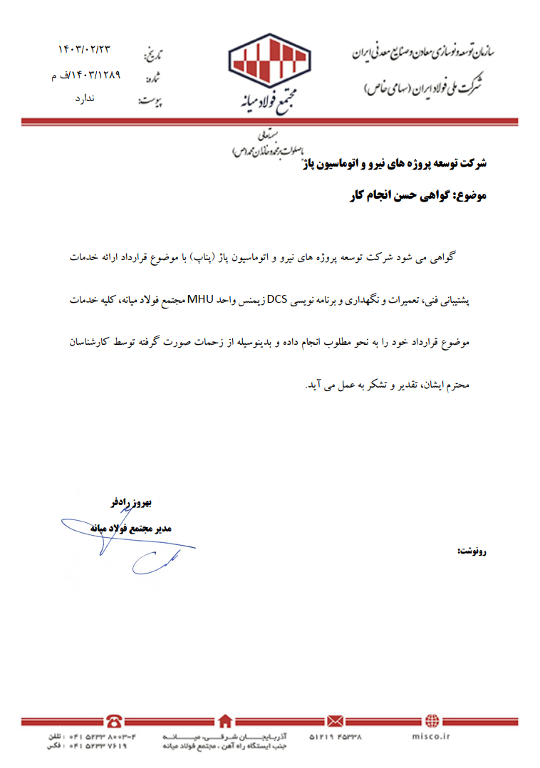 گواهی می شود شرکت توسعه پروژه های نیرو و اتوماسیون پاژ (پناپ) با موضوع قرارداد ارائه خدمات پشتیبانی فنی، تعمیرات و نگهداری و برنامه نویسی DCS زیمنس واحد MHU مجتمع فولاد میانه، کلیه خدمات موضوع قرارداد خود را به نحو مطلوب انجام داده و بدینوسیله از زحمات صورت گرفته توسط کارشناسان محترم ایشان، تقدیر و تشکر به عمل می آید.